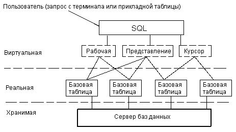 До сих пор понятие "таблица", как правило, связывалось с реальной или базовой таблицей, т.е. c таблицей, для каждой строки которой в действительности имеется некоторый двойник, хранящийся в физической памяти машины (рис.1.2). Однако SQL использует и создает ряд виртуальных (как будто существующих) таблиц: представлений, курсоров и неименованных рабочих таблиц, в которых формируются результаты запросов на получение данных из базовых таблиц и, возможно, представлений. Это таблицы, которые не существуют в базе данных, но как бы существуют с точки зрения пользователя.